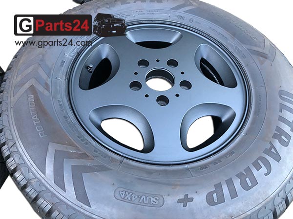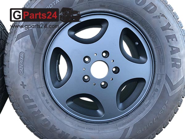 Sie erhalten hier von uns einen neu veredelten und einwandfreien Satz 4 Stück Original Mercedes Geländewagen 16 Zoll Felgen A4634010302 / B66470070 vom Typ „Atik“ ET63 an, auf denen neue Winterreifen Goodyear Wrangler Ultragrip + in 265/70/R16 Reifen montiert sind. Das DOT ist 39/2017. Die ATIK-Felge hat, ähnlich wie die 16-Zoll Ashtaroth-Felge, eine Traglast von 1200 kg. Sie wurde auch auch gepanzerten G-Klassen mit Notlaufringen montiert.