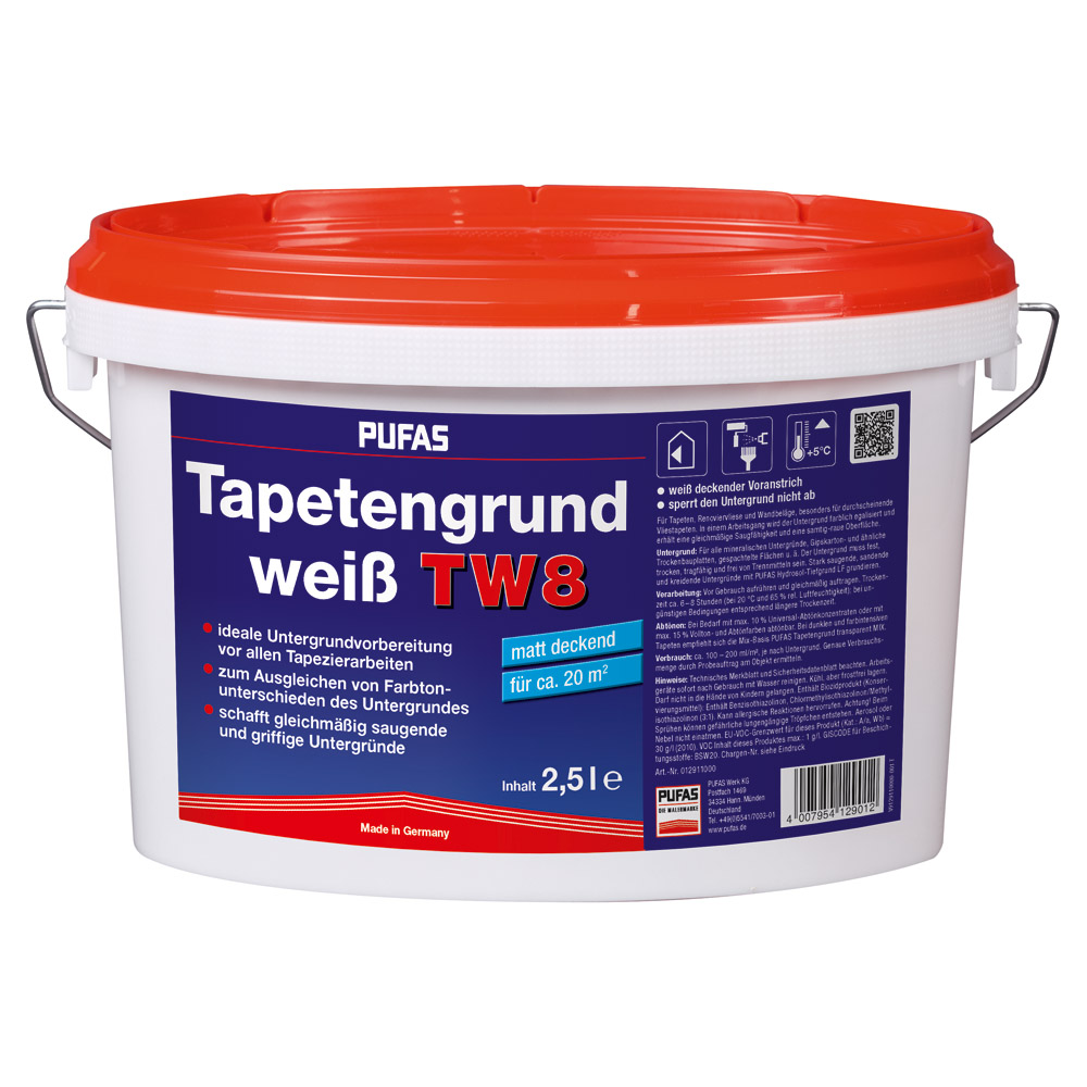 Weiß deckender Voranstrich zum Ausgleichen von Farbtonunterschieden des Untergrundes. Ideale Untergrundvorbereitung für Tapeten, Renoviervliese und Wandbeläge, besonders für durchscheinende Vliestapeten.
