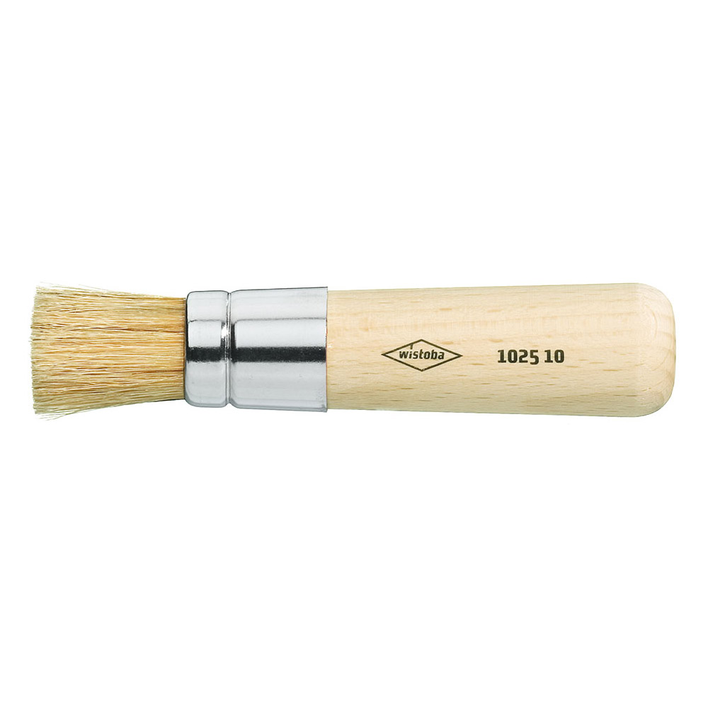Schablonierpinsel, helle Borsten, runde Kapseln, kurze abgerundete Holzstiele.
